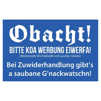 Hochwertiger Folienaufkleber mit dem dem Aufdruck "Koa Werbung" in Outdoorqualität. Ein absolutes Muss für jeden Briefkasten in Bayern!