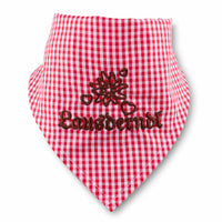 Süsses Kleinkind-Dreieckstuch mit edlem Stick "Lausderndl" mit Edelweiß und Herzal auf rot-weißem Karostoff. Sehr hochwertig verarbeitet mit bequemen Druckknopf. Das Tuch ist ca. 41 cm lang und passt ca. 1-3 jährigen Kindern.