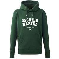Bei unserem Hoodie "Gscheidhaferl University" machen wir keine Kompromisse: Top-Qualität, 100% Bio-Baumwolle, vegan, fair-trade gehandelt und der Hoodie wird von uns für Dich vor Ort bedruckt.