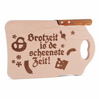 A Brotzeitbrettl, a Brotzeitmesser und a guade Brotzeit und schon wiads g'miatlich. Unser Brotzeitbrett "Brotzeit is de scheenste Zeit" ist ein echter Hingucker mit modernem Brandmotiv und beiliegendem Brotzeitmesser. Bayerische Brotzeitbretter sind eine tolle, ausgefallene Geschenkidee - es ist immer ein toller Hingucker!