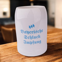 Hochwertiger Stein-Bierkrug mit Motiv "Bayerische Schluck Impfung". Unsere Bierkrüge werden vor Ort für Dich bedruckt.