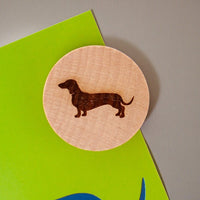Witziger Holzmagnet "Dackel" mit starkem Magnet auf der Rückseite. Hochwertig vor Ort für Dich graviert - ein echter Hingucker!