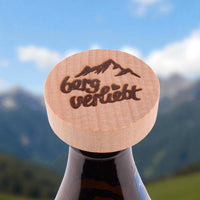 Witziger Holzstopsl "bergverliebt" für alle gängigen Kronkorkenflaschen. Schützt dein Getränk perfekt gegen Insekten, Staub und den nervigen Banknachbarn! :-)
