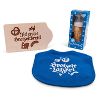 Das absolute Muss für alle kleinen Bayern! Unser Brotzeit-Set mit kleinem Brotzeit-Brettchen, Baby-Lätzchen und unserem Nuckelkrug. Einfach eine goldige Geschenkidee zum Geburtstag.