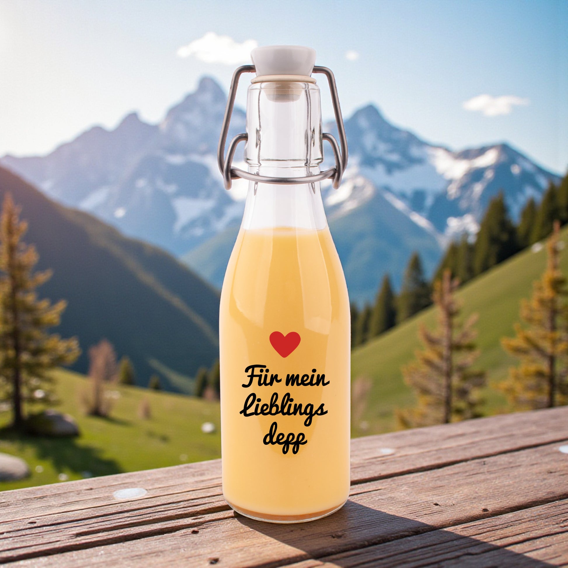 Likör/Schnaps "Für mein Lieblingsdepp" in der hübschen Bügelflasche. Der "Inhalt" kann frei gewählt werden. Wir dekorieren die Flasche just-in-time nach deinen Wünschen.