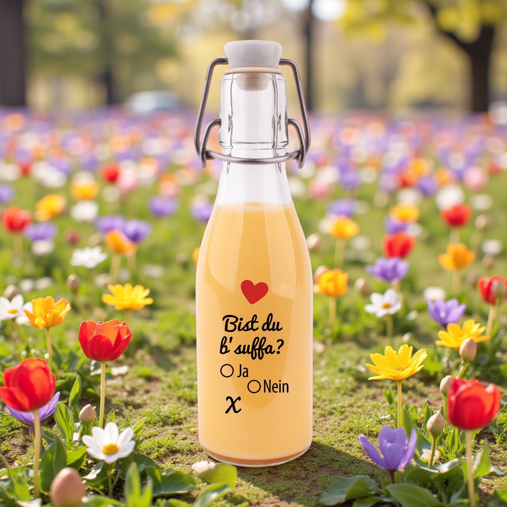 Likör/Schnaps "Bist du b'suffa?" in der hübschen Bügelflasche. Der "Inhalt" kann frei gewählt werden. Wir dekorieren die Flasche just-in-time nach deinen Wünschen.