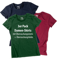 Wir haben einen Überschuss an Damen-Shirts in einzelnen Größen. Daher wollen wir unseren Bestand etwas reduzieren. Du erhältst 3 Damen-Shirts in einer Größe mit Überraschungsmotiv + Überraschungsfarbe.