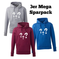 Wir haben einen Überschuss an Hoodies in einzelnen Größen. Daher wollen wir unseren Bestand etwas reduzieren. Du erhältst 3 Hoodies in einer Größe mit Überraschungsmotiv + Überraschungsfarbe.