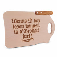 A Brotzeitbrettl, a Brotzeitmesser und a guade Brotzeit und schon wiads g'miatlich. Unser Brotzeitbrett "d'Brotzeit is furt!" ist ein echter Hingucker mit modernem Brandmotiv und beiliegendem Brotzeitmesser. Bayerische Brotzeitbretter sind eine tolle, ausgefallene Geschenkidee - es ist immer ein toller Hingucker!