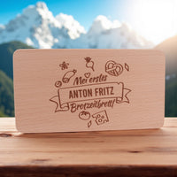 Süßes bayerisches Brotzeitbrettl mit Motiv "Mei erstes Brotzeitbrettl" und Wunschnamen-Gravur. Bitte Namen in das Textfeld eintragen.