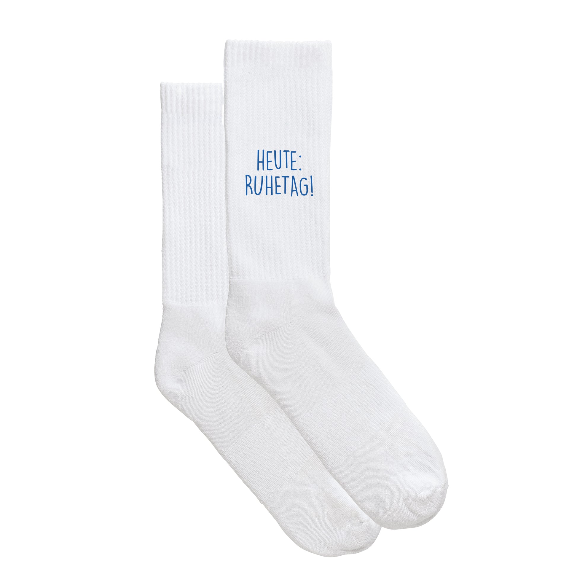 Sportsocken "Heute: Ruhetag!" - ein echter Hingucker - egal ob dahoam, im Gym oder im Büro. Die Socken werden vor Ort für Dich just-in-time bedruckt.